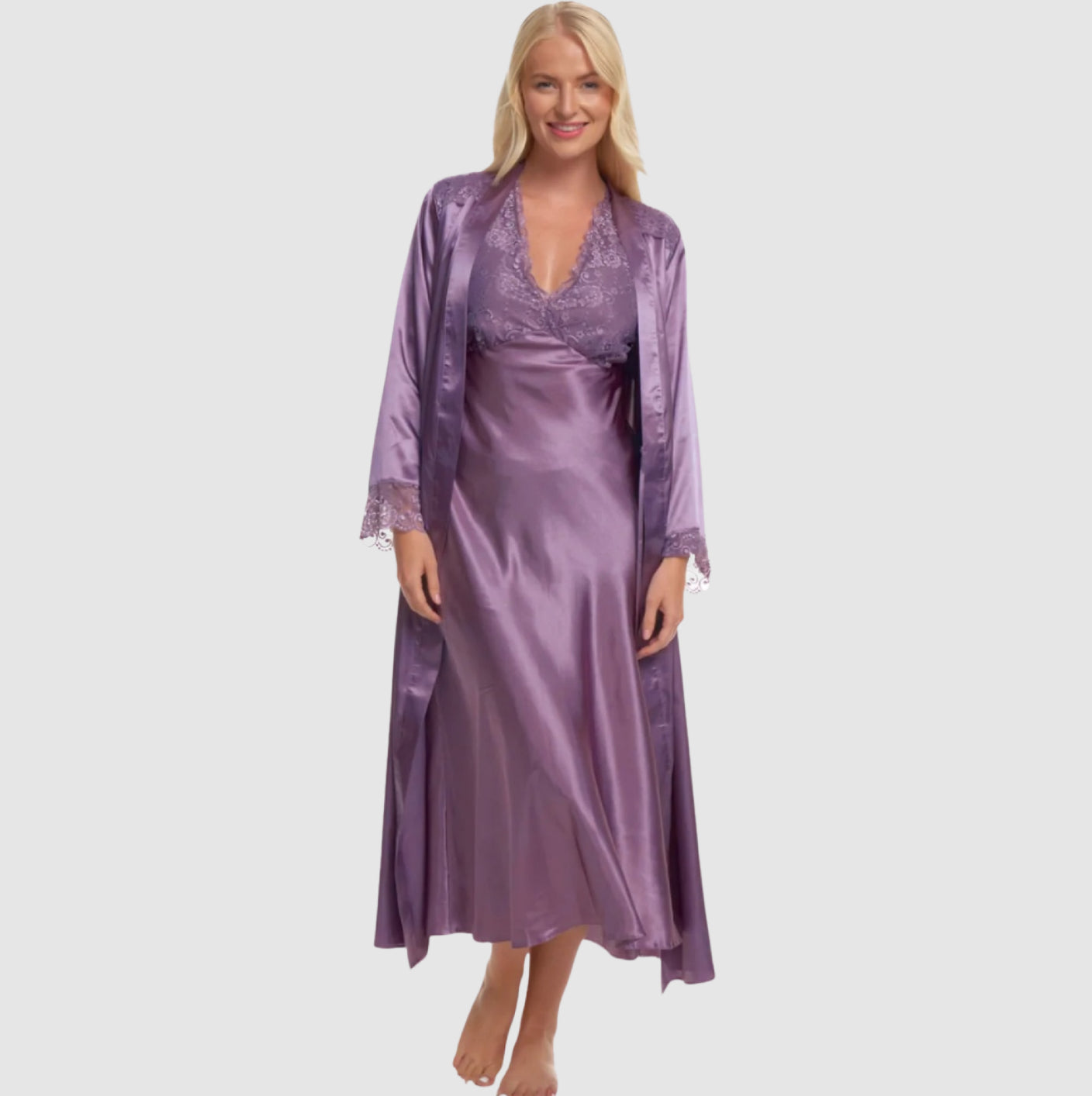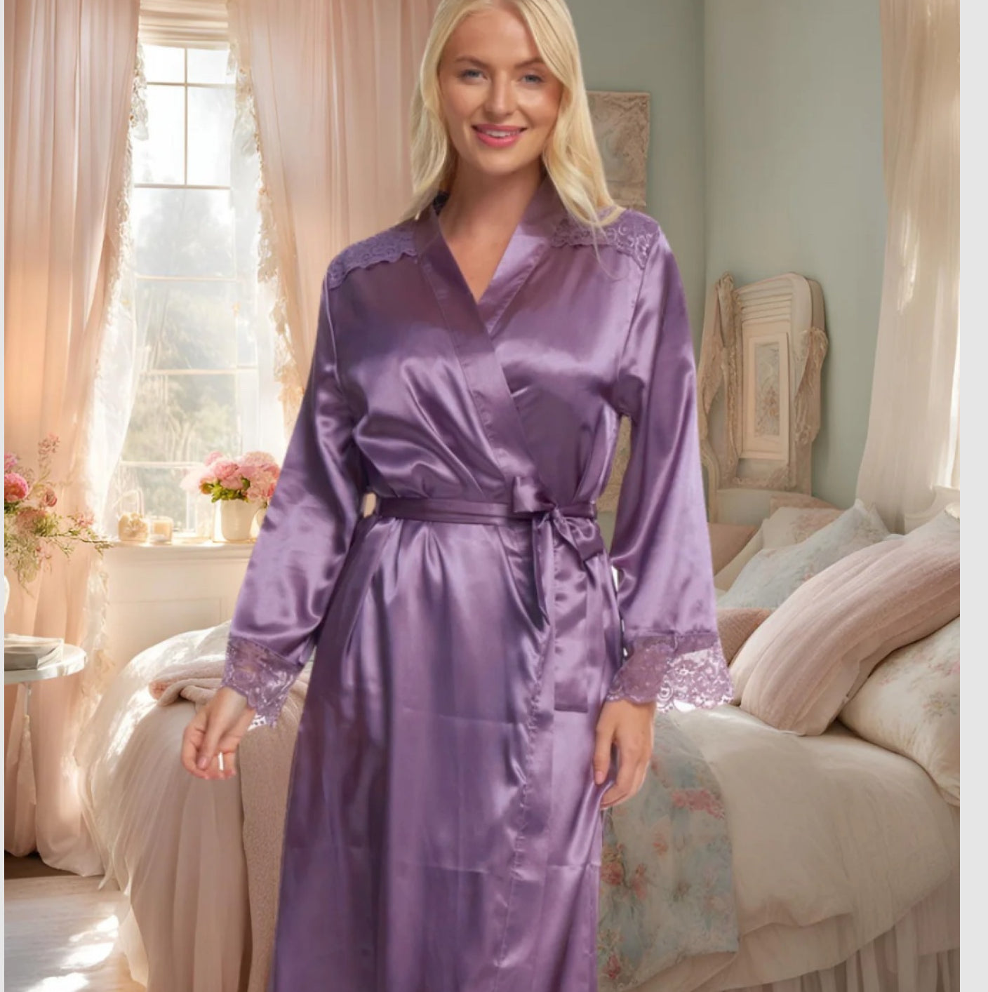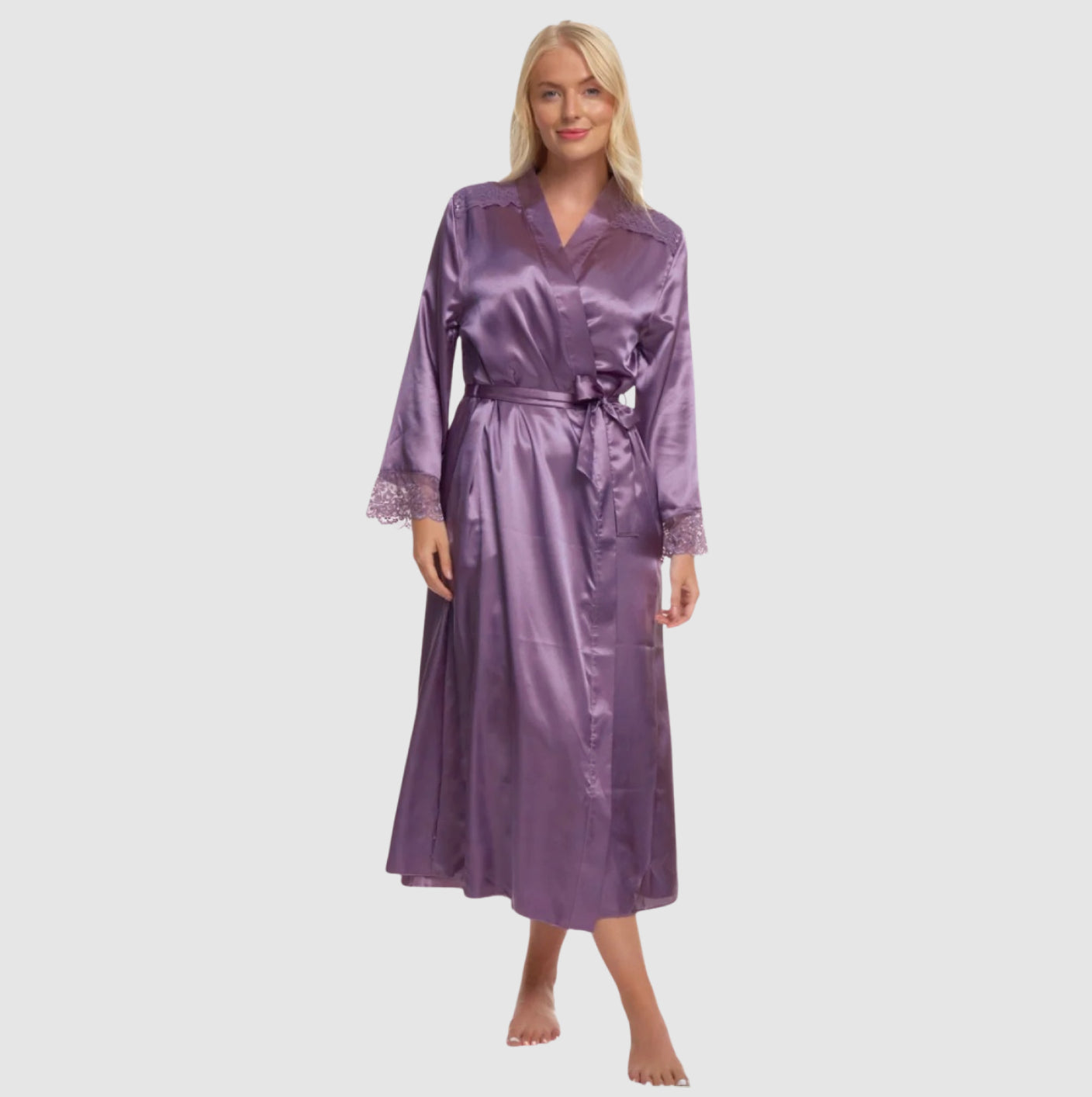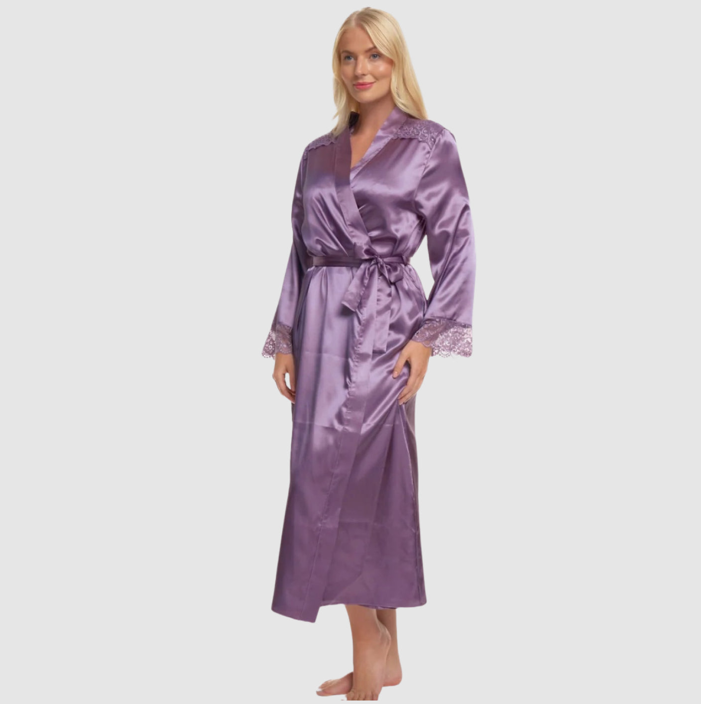 Indulge in the epitome of luxury with our Satin & Lace Dressing Gown, expertly designed to elevate your home lounging experience.